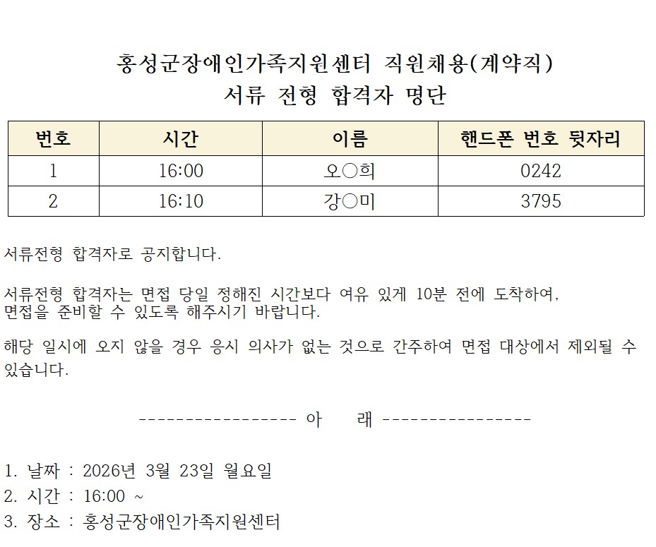2026년 홍성군장애인가족지원센터 직원-계약직 채용(재공고) 서류 전형 결과 안내 페이지 정보 작성자 가족지원센터 댓글 댓글 0건 조회Hit 8회 작성일Date 26-03-18 16:32 본문 . 목록 다음글2026년 홍성군장애인가족지원센터 직원-계약직 채용 재공고 26.03.03 댓글 0 댓글목록 등록된 댓글이 없습니다.