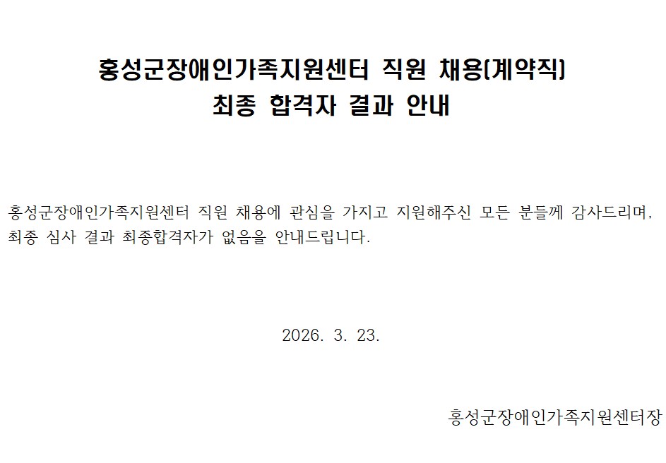 홍성군장애인가족지원센터 직원 채용(계약직) 최종 합격자 결과 안내 페이지 정보 작성자 가족지원센터 댓글 댓글 0건 조회Hit 24회 작성일Date 26-03-23 15:16 본문 . 목록 다음글2026년 홍성군장애인가족지원센터 직원-계약직 채용(재공고) 서류 전형 결과 안내 26.03.18 댓글 0 댓글목록 등록된 댓글이 없습니다.