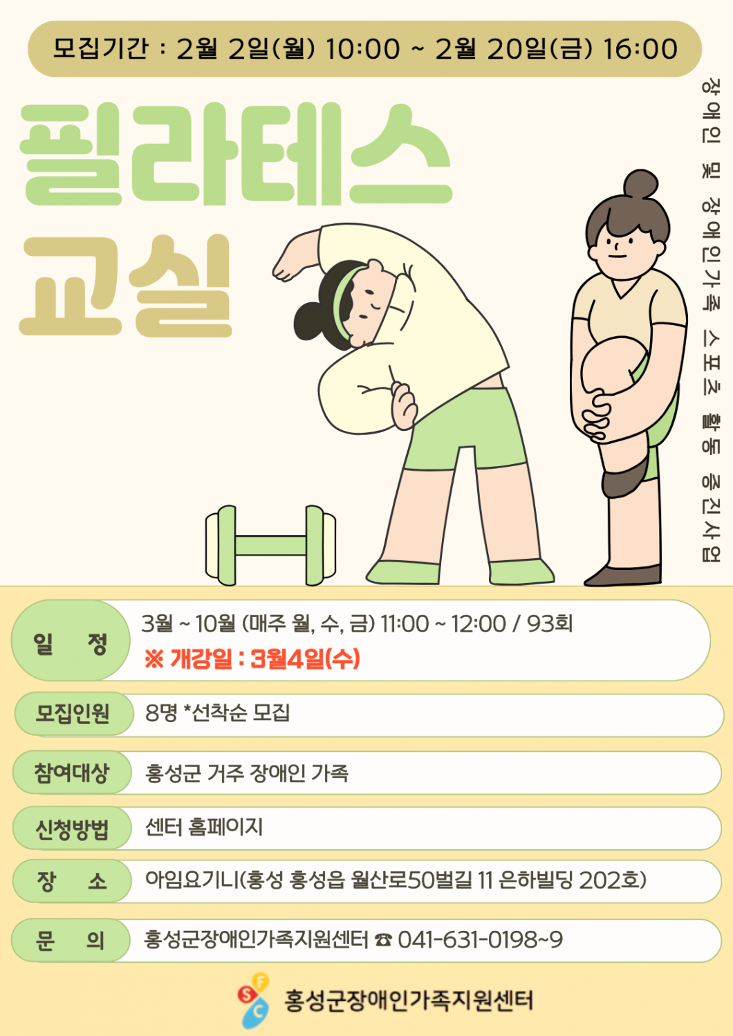 2026년 장애인 및 장애인가족 스포츠 활동증진 사업 - 필라테스교실에 함께 할 참여자를 모집하고 있습니다. 아래 내용을 확인 후 신청해 주시기 바랍니다.